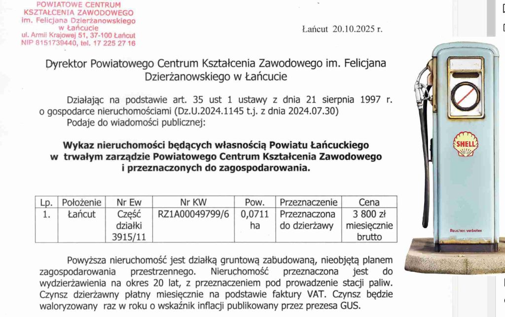 Wykaz nieruchomości będących własnością Powiatu Łańcuckiego w trwałym zarządzie Powiatowego Centrum Kształcenia Zawodowego i przeznaczonych do zagospodarowania.